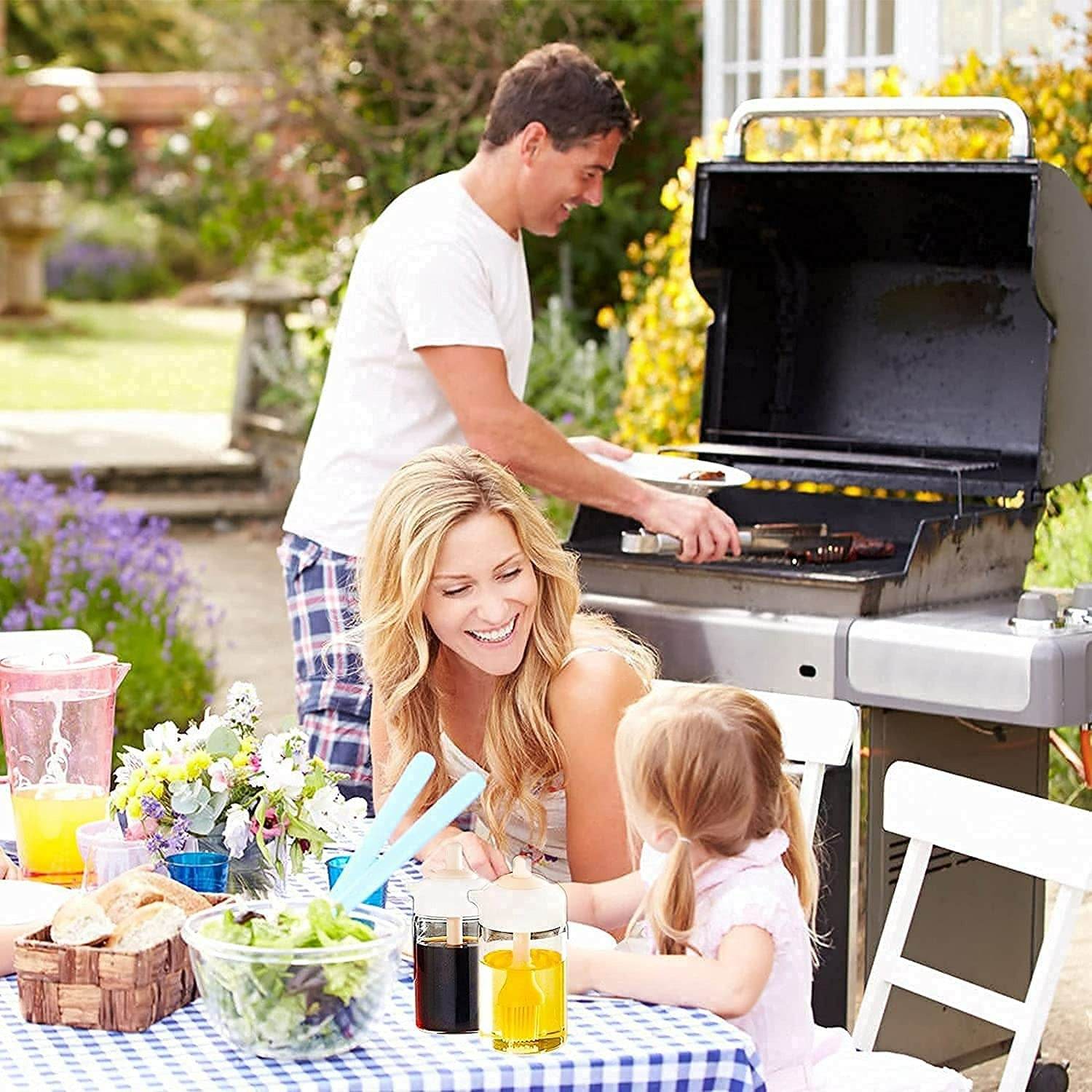The oil bottle has a small spout to pour oil, you can press brush top to speed up the oil stream or you can use the top silicone brush to evenly coat your food.