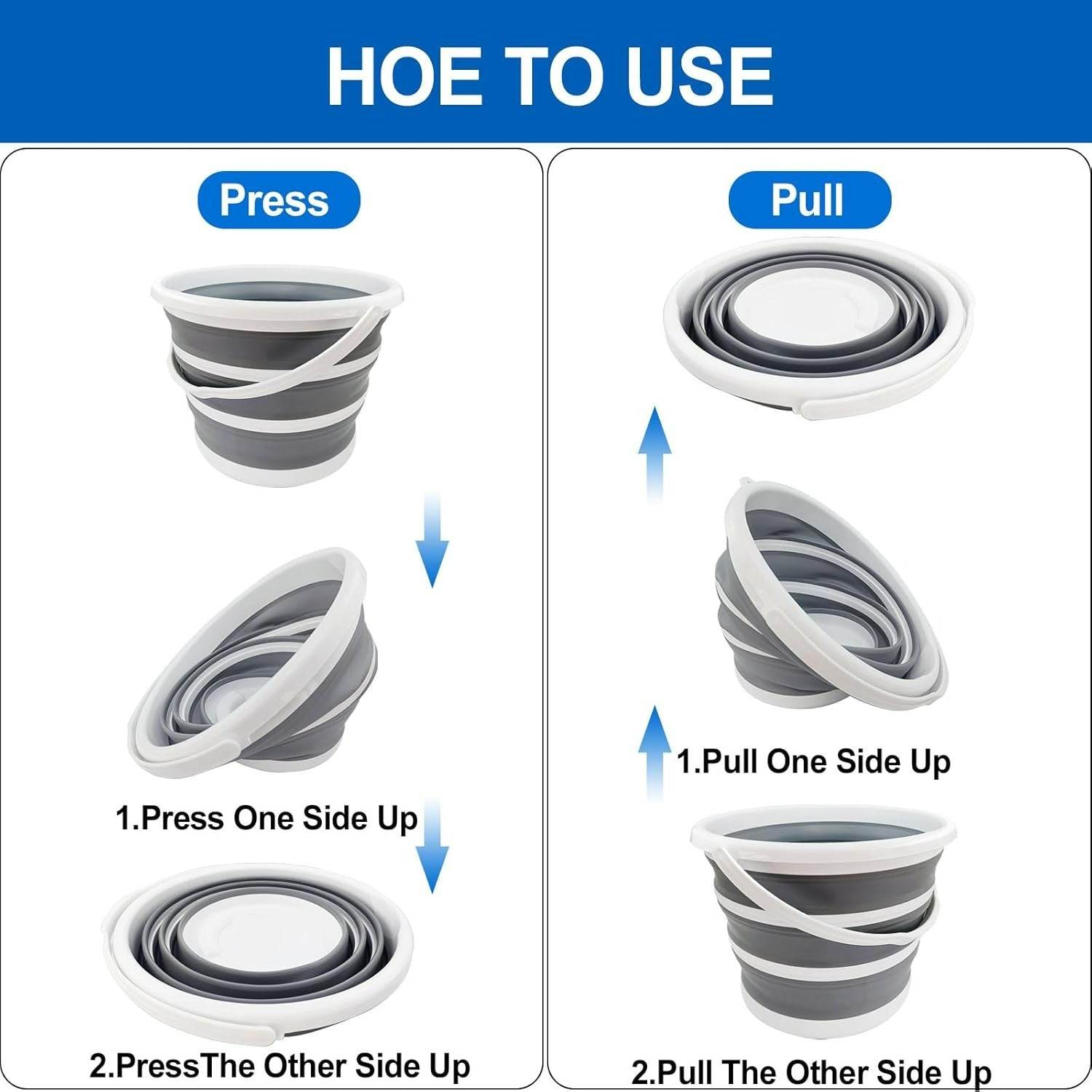 The collapsible bucket can be used for more than just holding water. You can use it while picking berries, gathering food, or for holding rubbish. Alternatively, a collapsible bucket can be used at the beach as a sand toy. Afterward, it can be transformed into a laundry basket. Gardeners can use a collapsible bucket to carry soil or plants, while hosts can use it for parties to hold ice cubes and drinks. Designed with a hanging ring for easy storage and a sturdy, ergonomically designed handle that makes it easy to carry. The bottom has grooves to make it easier to pour out liquids. This collapsible bucket is ideal for home use, camping, parties, and even backpacking and biking.