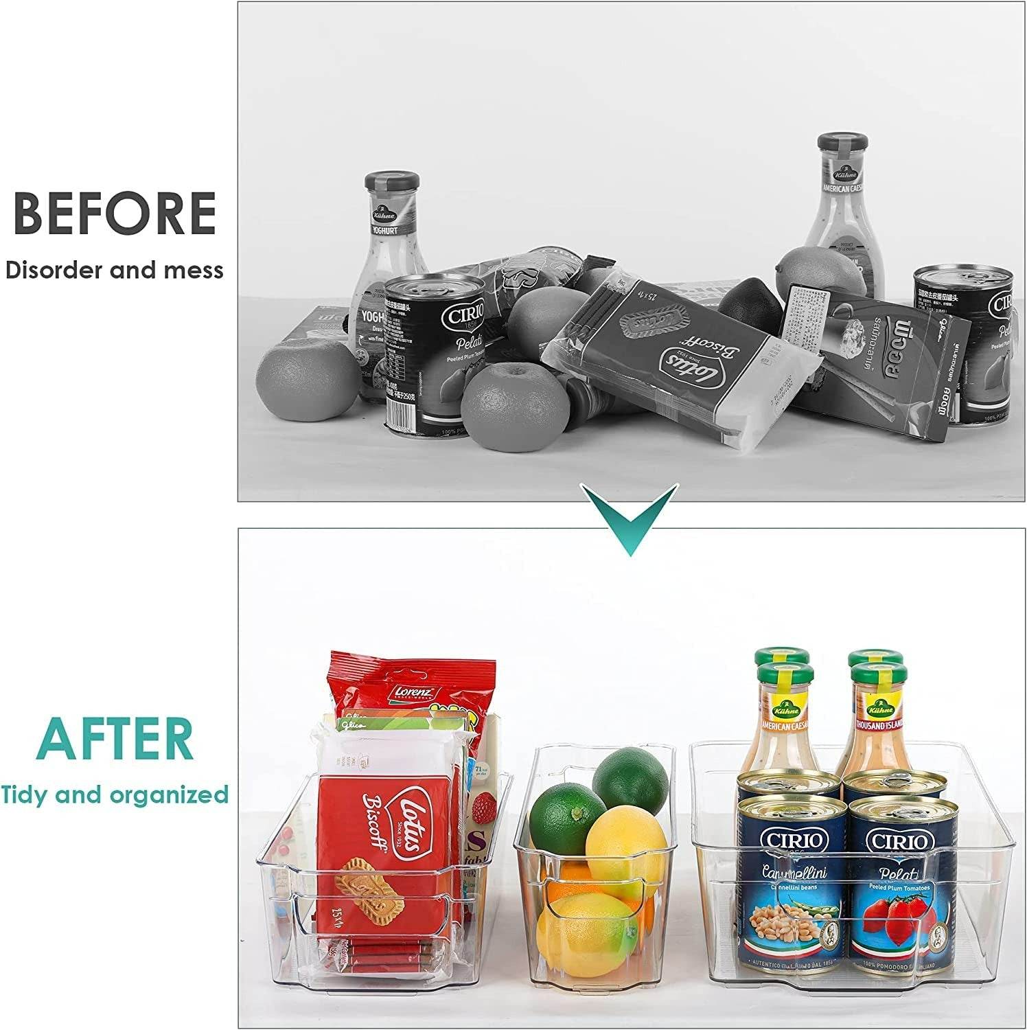 Size: 9.5x21x37 cm. These are great for placing items in hard to reach cabinets and shelves! Built-in, easy-grip side handles make it easy to transport from shelf to table or island; Organize all of your kitchen essentials and create handy go-to supply baskets to make organizing and everyday living a little easier; Store kitchen essentials: towels, candles, baking supplies, straws, and skewers. These large capacity bins are great for creating a clean and organized refrigerator or pantry; Ideal for yogurts, canned goods, food packets, cheese, meat, drink boxes, baby food, juices, boxed foods, potatoes, onions, and apples. The perfect depth for lower cabinets and deep pantry shelves as well as inside the fridge or freezer; They hold everything from pet food, to vegetables or even clothing.