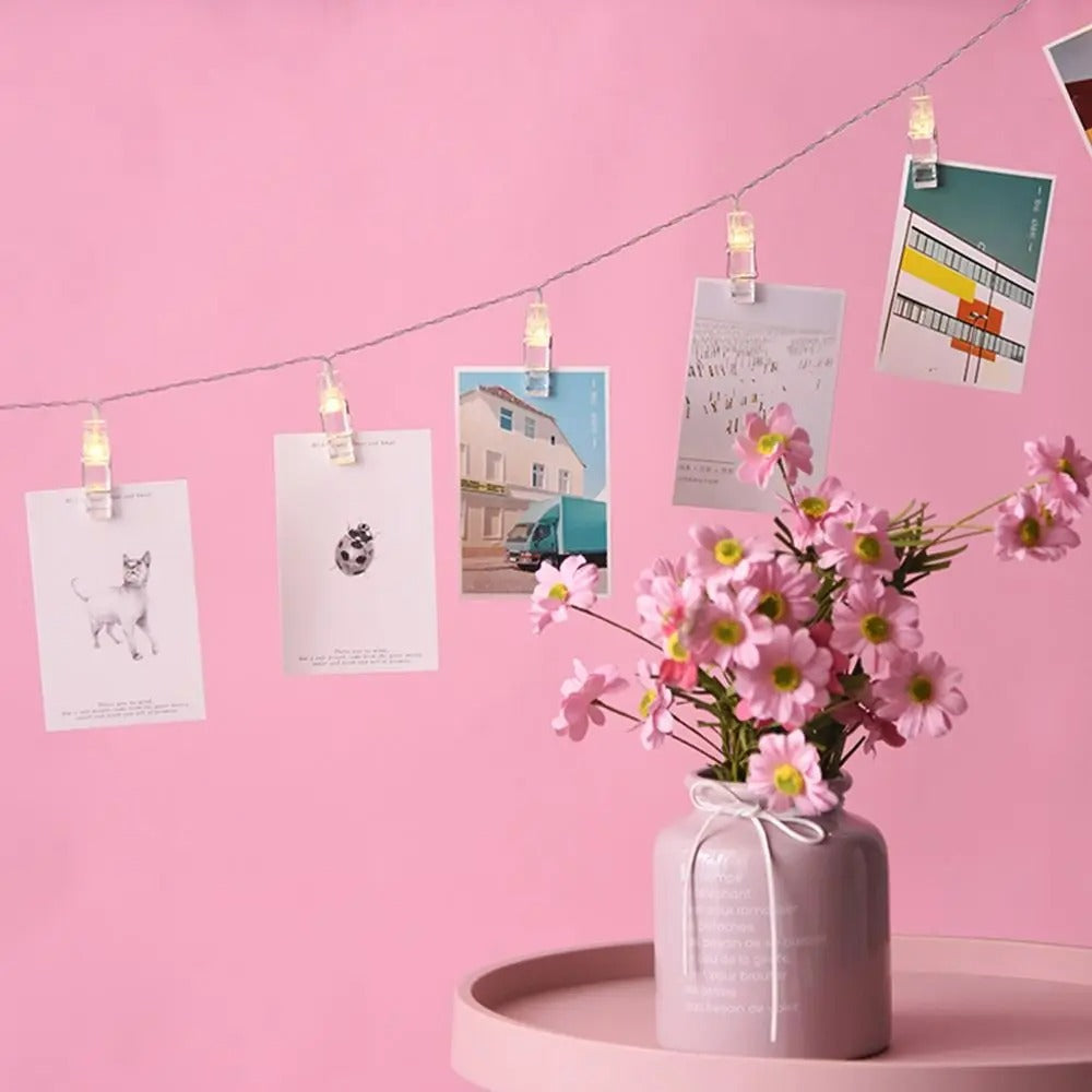Solar Operated. Dark wire. Display your most loved memories in a glowing halo with these quirky LED Photo Peg String Lights. They feature ten individual PVC pegs that beautifully illuminate pictures or small keepsakes with a warm white twinkle.