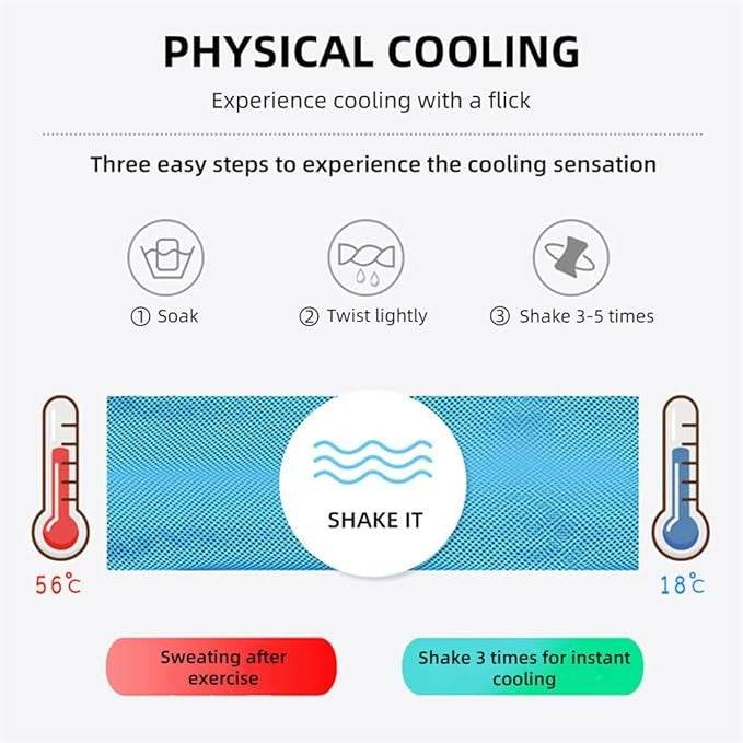 Soak the towel in water, wring out the excess water and it will cool down immediately. It's better if you put it in the refrigerator to cool down! Towels can stay cool for up to 3 hours. If it doesn't work as cooling, just soak it in cold water again.