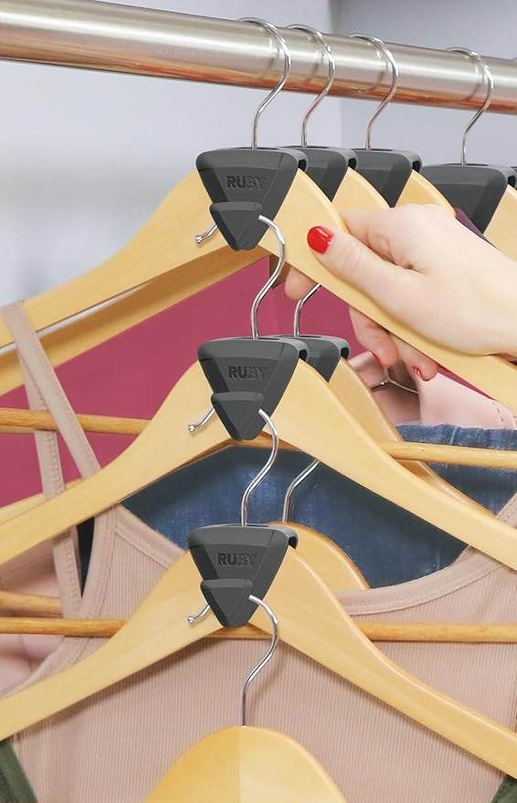 RUBY SPACE TRIANGLES hooks are compatible with most hangers available on the market, whether plastic, wood, wire or velvet. No matter what kind of hanger you use, you can save space in your hanger with these clever hooks.