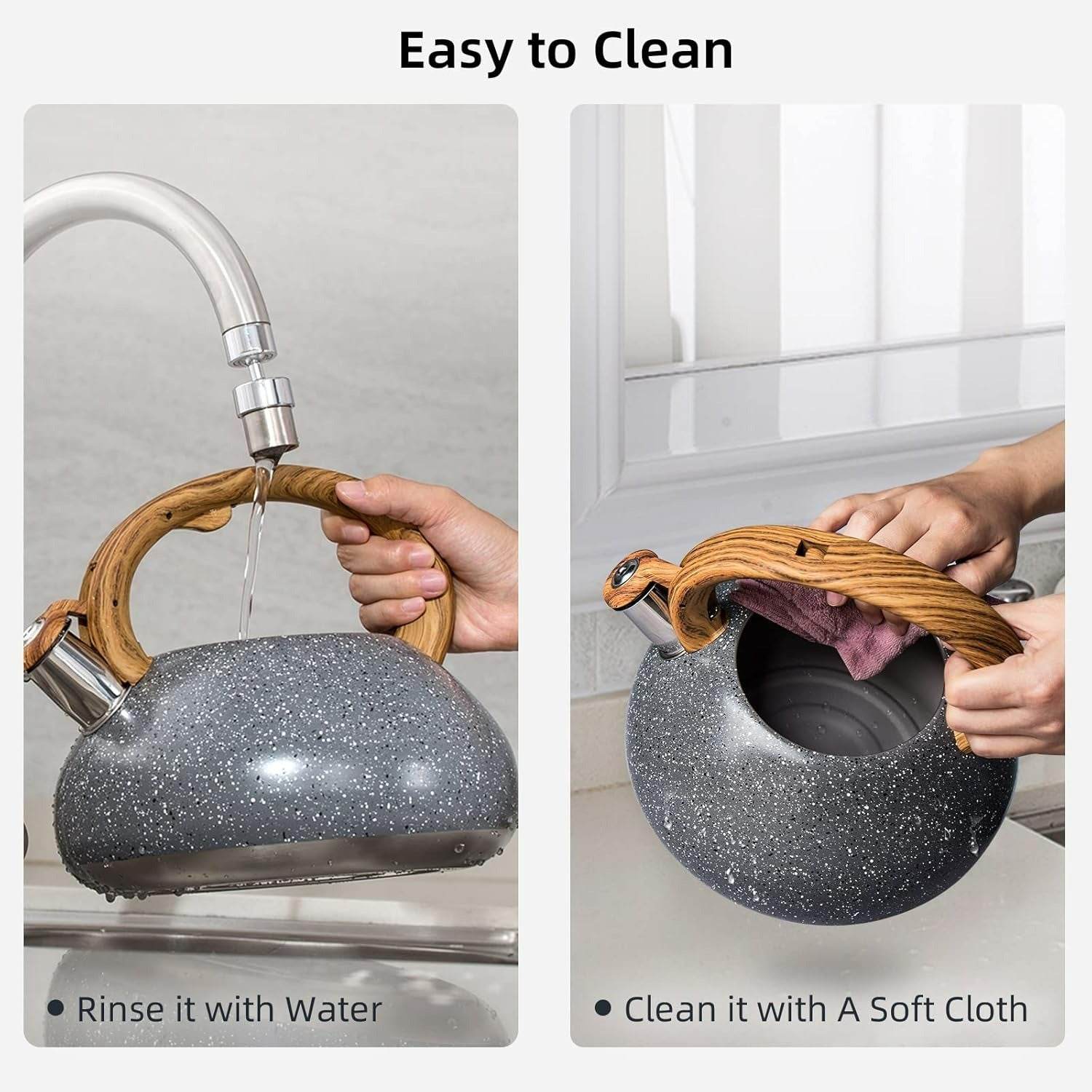 Available in black or brown. Applicable to various heat sources like induction gas natural gas ceramic and electro stovetops. Loud whistling tea kettle alerts when boiling. Wood grain TPR coating of the nylon handle makes the handle stay cool for easy grip; Flip-up spout cover for safe and easy pouring. After using the teapot rinse it with water clean with a soft cloth air-dry and put the kettle in a dry airy place.