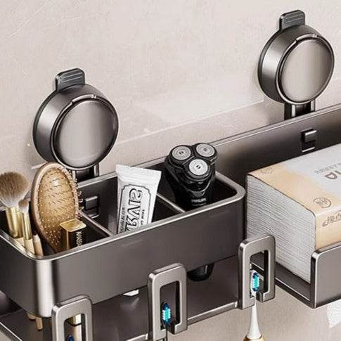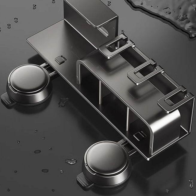 Upgrade your bathroom with this all-in-one wall-mounted organizer, designed for families or shared spaces. Featuring three inverted toothbrush cups, a spacious toothpaste holder, and a multi-use compartment for razors, combs, or skincare essentials, this unit keeps everything neat and within reach.