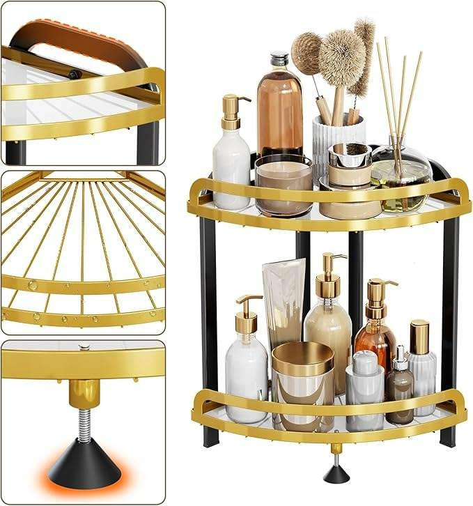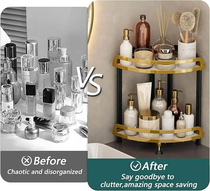 Countertop corner shelf is suitable for any corner space to help you maximize your storage options. Place it in kitchen cabinets and countertops to store more spice bottles and cans. Great for vanity top organization, store cosmetics, toiletries. Leave storage space in your den for notepads and all office supplies. Great for organizing all kinds of cleaning supplies and tools in your laundry room as well.